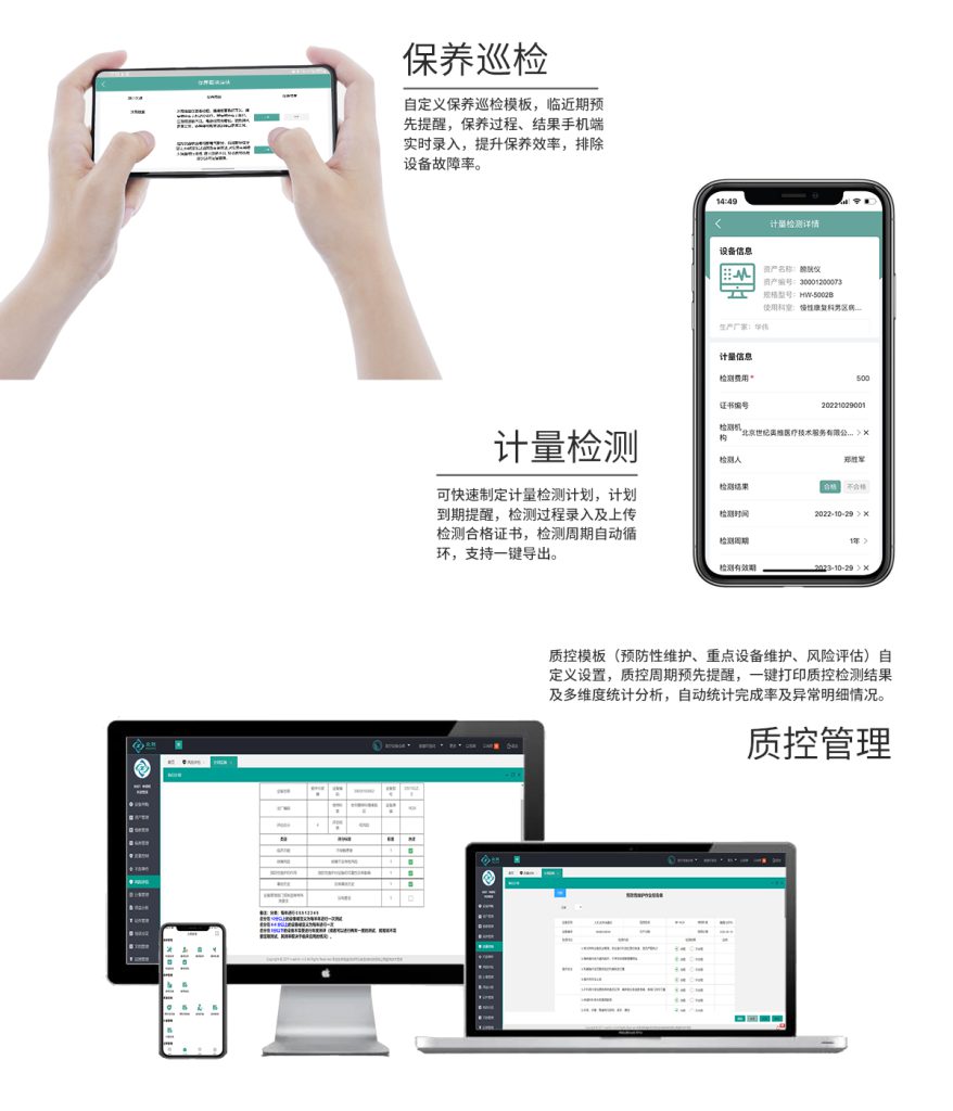 手机端与PC端均可实保养、巡检、预防性维护模板自定义,快速生成质控计划,到期提醒;计量、不良事件等功能。